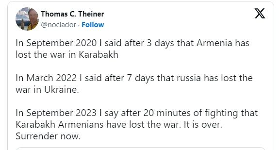 "In September 2020 I said after 3 days that Armenia has lost the war in Karabakh In March 2022 I said after 7 days that Russia has lost the war in Ukraine. In September 2023 I say after 20 minutes of fighting that Karabakh Armenians have lost the war. It is over. Surrender now," the Theiner wrote.
