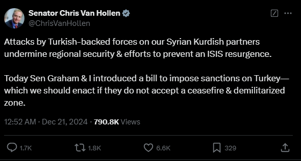 In a post on his official X account, Van Hollen stated, "The attacks by Turkish-backed forces against our Syrian Kurdish partners undermine regional security. If Türkiye does not accept the ceasefire and demilitarized zone, we must impose sanctions."