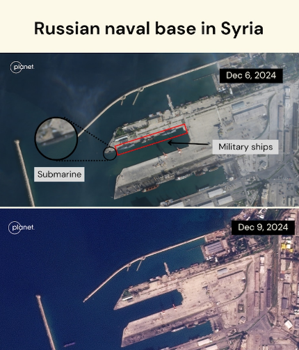 The arrival of two Russian cargo ships, Sparta and Sparta II, at the port of Tartus on January 22 has intensified speculation about Russia's next steps in the Middle East and North Africa. With heavy weapons, military vehicles, and ammunition loaded on the ships, and Syria's abrupt termination of a 49-year lease agreement for the port, experts are questioning the implications for Moscow’s military presence in the region. A few months ago Russian military vessels were missing from a satellite image captured by American geospatial firm Planet Labs PBC on December 9, a day after Assad fled Syria. Ships were not seen in imagery clicked on December 1 and December 3 either, but that could be attributed to their participation in a joint military drill of the Russian Navy and its Aerospace Forces in the Mediterranean Sea. The exercise took place between December 1 and December 3.