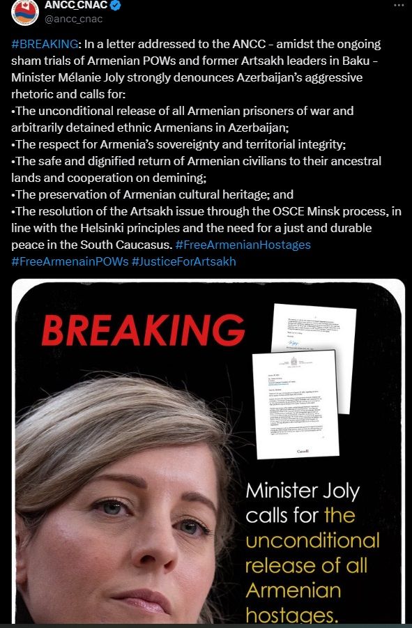 It should be noted that representatives of the Armenian National Committee, one of the most active and brazen organizations of the Armenian lobby, spread across America and Canada, have recently started making a fuss about a group of war criminals imprisoned in Baku. The published claims state that officials also want their release, but when it comes to the fact that FM Mélanie Joly and others have expressed such an opinion, this cannot be confirmed. Therefore, Azernews continued to find in-depth reports and visited Madam Joly’s X page. Looking at the latest posts, we cannot find any information about the imprisoned war criminals. It seems that the FM herself is not aware of the information published about her on social media networks by Armenians.