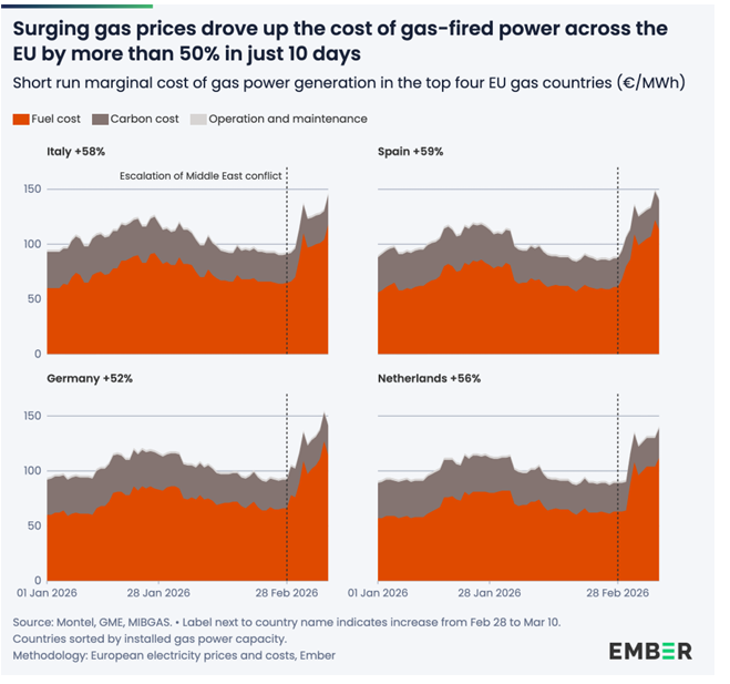 As a net energy importer, Europe is grappling with soaring prices—gas futures have doubled and oil prices have risen by more than 50% since the start of the year. According to global energy think tank Ember, wind and solar accounted for 30.1% of EU electricity generation in 2025—well short of the 60%-plus target for 2030. Meanwhile, energy security remains fragile: in the first ten days of the latest Middle East conflict, the cost of gas-fired power in Europe jumped by more than 50%. Shell’s executive Wael Sawan warns energy shortage as early as next month.