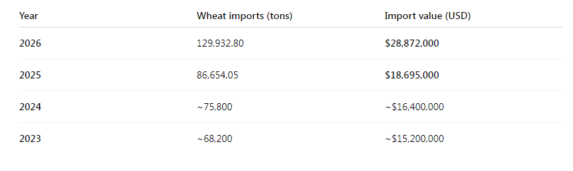 In January 2025, the country imported 86,654.05 tons of wheat with a value of $18,695,000. Compared with the same period in 2026, wheat imports increased by about 50 percent in volume and 54.4 percent in value.