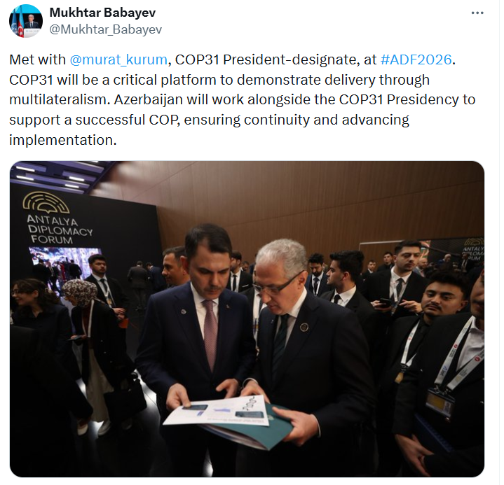 Mukhtar Babayev, Presidential Representative of Azerbaijan on climate issues, met with Murat Kurum, Minister of Environment, Urbanization and Climate Change of Türkiye and COP31 President, in Antalya, AzerNEWS reports.
