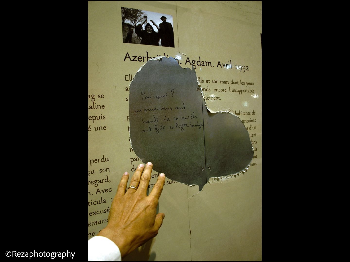 Determined to share the news, Reza Deghati took the first flight from Baku to Istanbul and then to Paris, where he worked to distribute his photographs in international media and exhibit them internationally—despite considerable pressure and physical attacks on his exhibitions by the Armenians in France, Reza, a professional photojournalist, remained resolute in his mission to present the historical evidence he had documented.