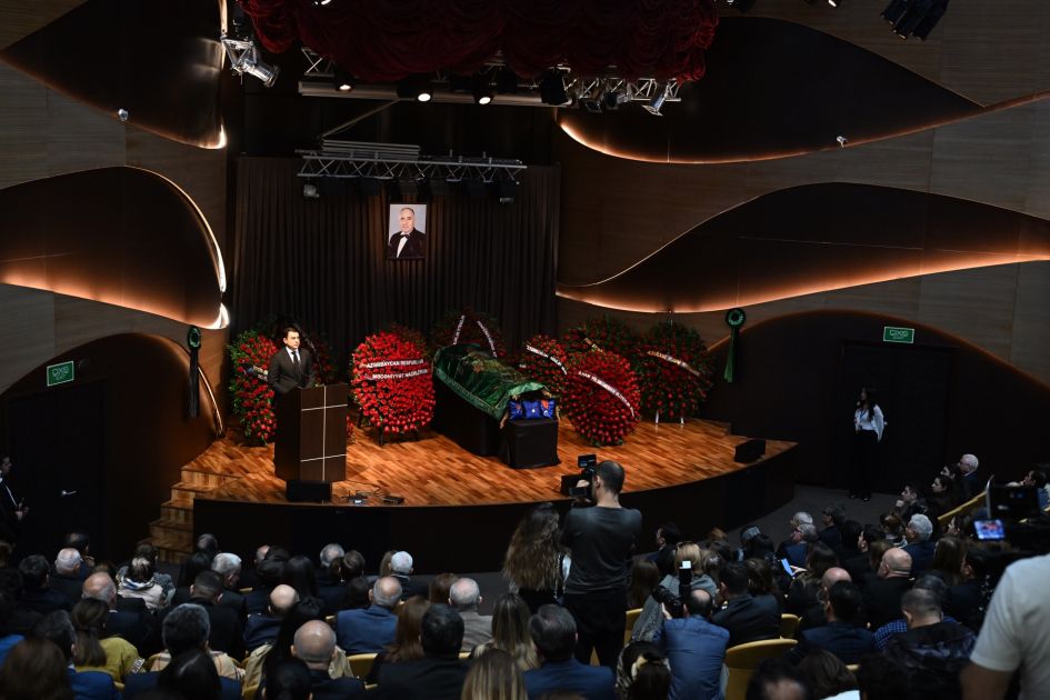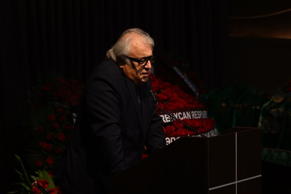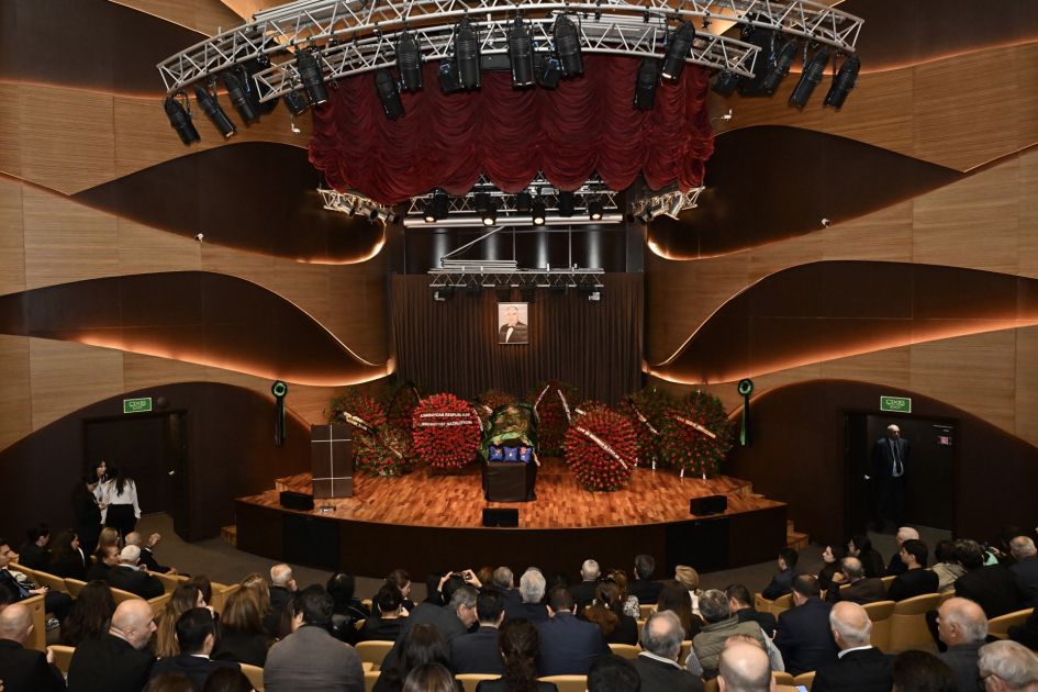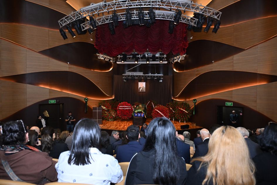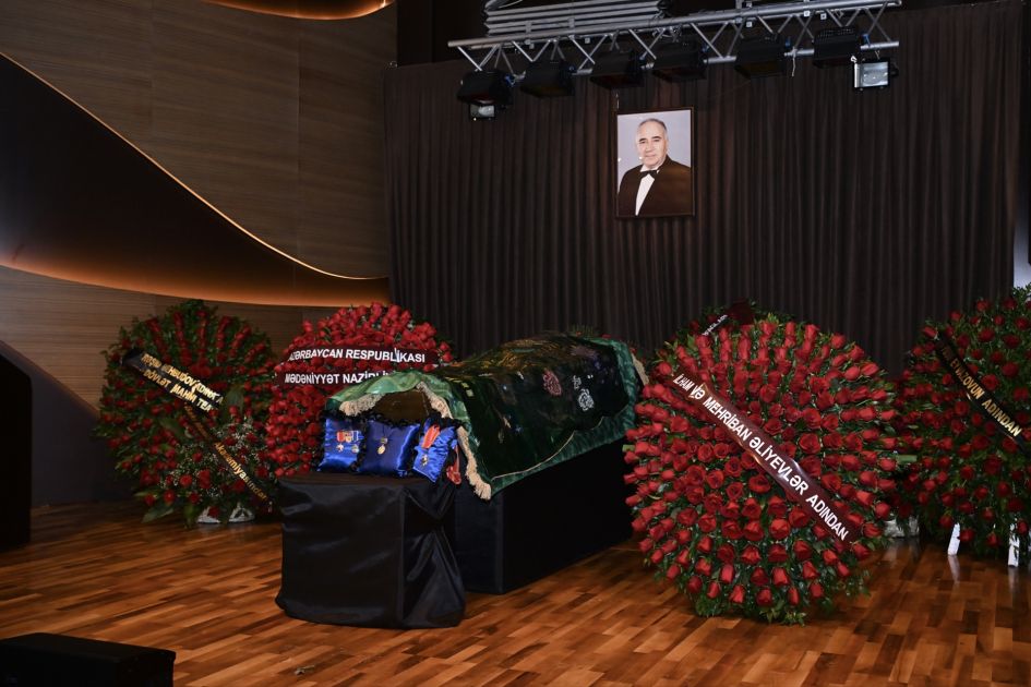 The late artist's body was placed on a pedestal on the mourning-adorned stage of the International Mugham Center.