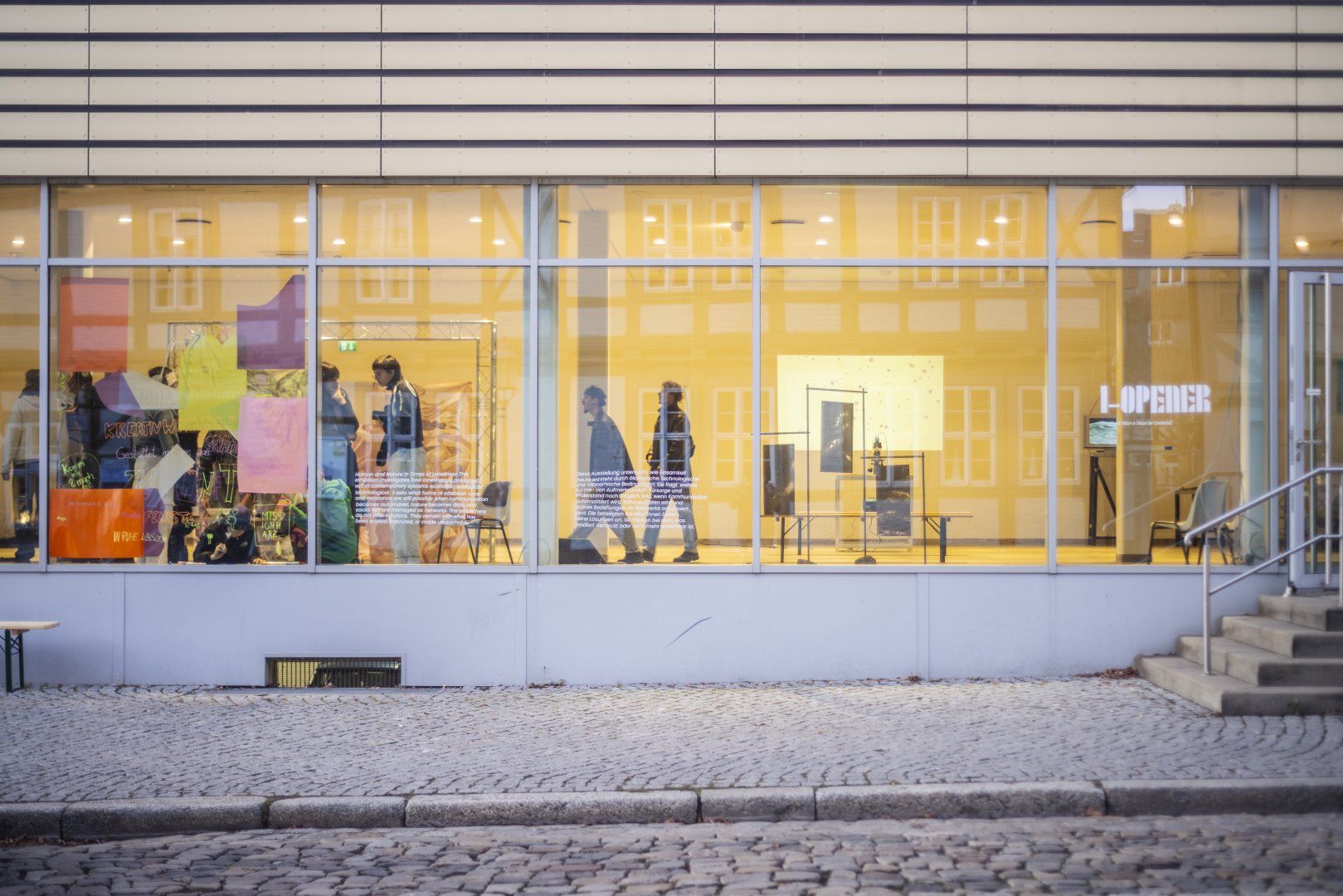 The exhibition explored loneliness not only as a personal feeling, but also as the result of an environment overloaded with signals, information, and visual images, as well as technological, ecological, and institutional structures. The curatorial approach incorporated beer garden benches as symbols of public space, emphasizing that public life is only possible through active, practical participation.