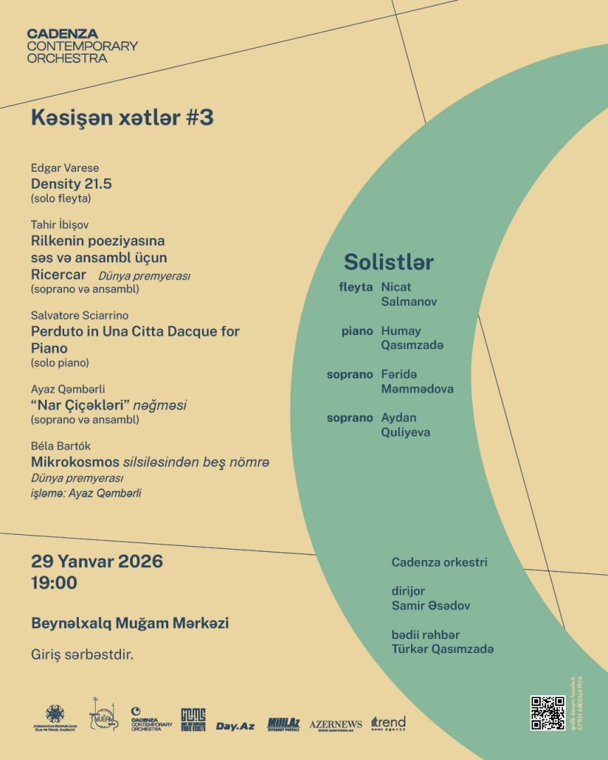 The concert program features Edgar Varèse's "Density 21.5", Tahir Ibishov's "Riercar" for voice and ensemble based on the poetry of Rainer Maria Rilke, Salvatore Sciarrino's "Perduto in una città d’acque" for Piano, Ayaz Gambarli's song "Pomegranate Blossoms", as well as five pieces from Béla Bartók's "Mikrokosmos" cycle.