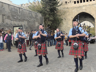 Bagpipers` marching through the streets of the Old City lasted about an hour and ended near the Maiden Tower. A truly festive mood enlivened the Old City as national dances were performed in front of the Maiden Tower.