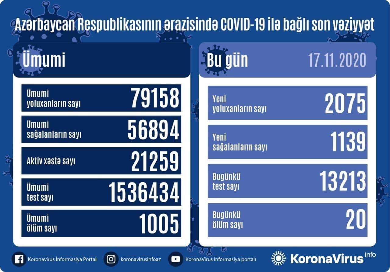 Azerbaijan registered 2,075 new COVID-19 cases in the past 24 hours, Operational Headquarters under Cabinet of Ministers reported on November 17.