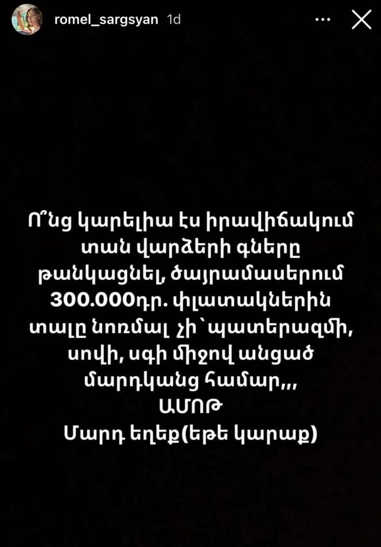 "How can rent prices be increased in this situation? It is not normal to give 300 thousand drams (about $800) to the poor in the suburbs, to people who have gone through war, famine, and mourning. A shame. Be human (if you can)," the actress wrote.