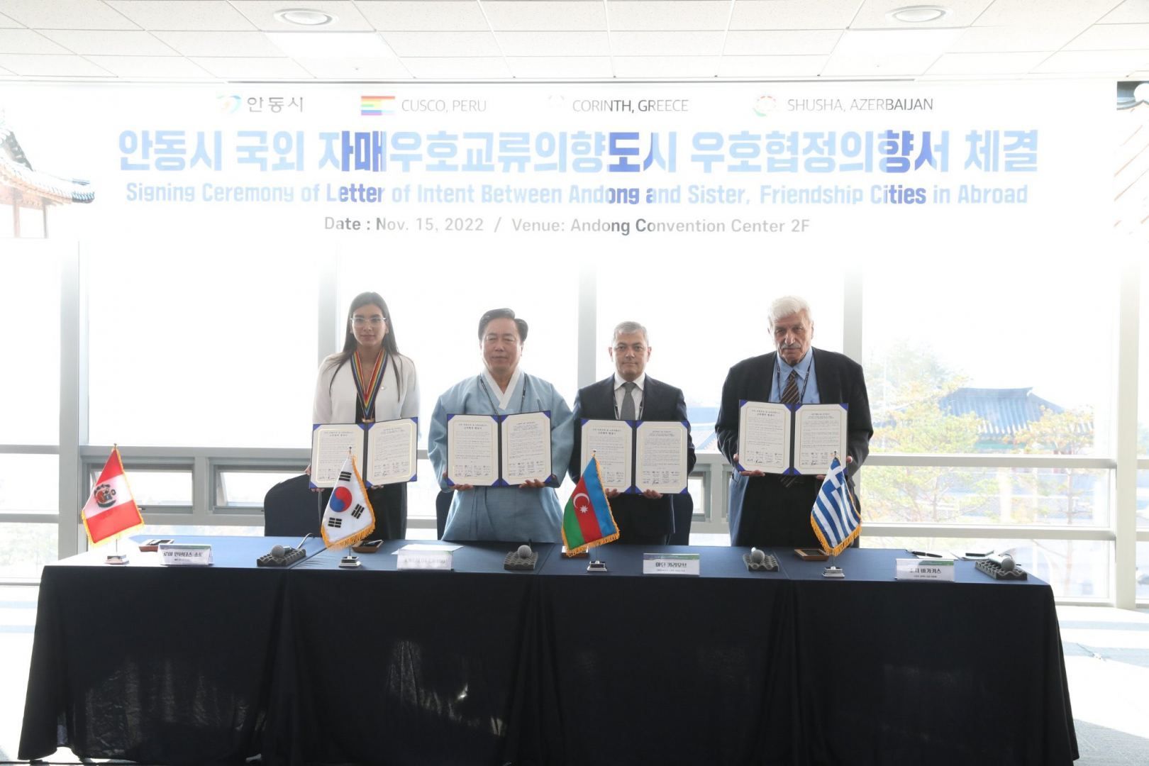 Azerbaijan's Shusha, Korea's Andong, Peru's Cusco, and Greek Corinth cities signed a four-way protocol on cooperation within the framework of the 18th World Conference of Historical Cities in Andong. Special Representative of Azerbaijani President in Shusha district Aydin Karimov tweeted about it.