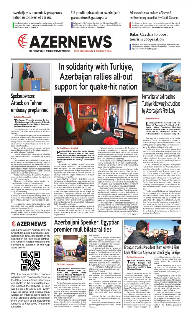 The new edition includes several interesting articles, such as "Spokesperson:Attack on Tehran embassy preplanned"; "Azerbaijani Speaker, Egyptian premier mull bilateral ties"; "Humanitarian aid reaches Turkiye following instructions by Azerbaijan's First Lady"; "Erdogan thanks President Ilham Aliyev & First Lady Mehriban Aliyeva for standing by Turkiye" etc.
