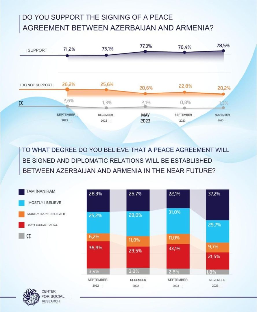 According to the results of the opinion poll conducted in November this year, 78.5 percent of respondents in Azerbaijan support the peace treaty with Armenia, 20.2 percent do not support the peace treaty, and 1.3 percent found it difficult to answer.