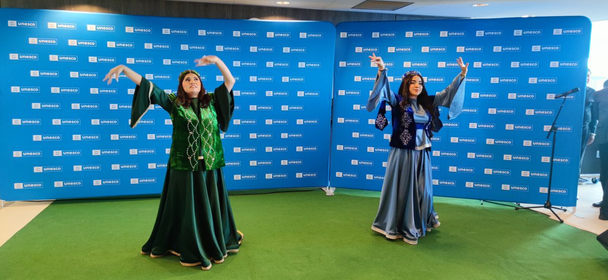 The Azerbaijani tea stand decorated with national souvenirs displayed French-language publications of the Heydar Aliyev Foundation on monuments of cultural and historical heritage included in UNESCO's list of Intangible Cultural Heritage.