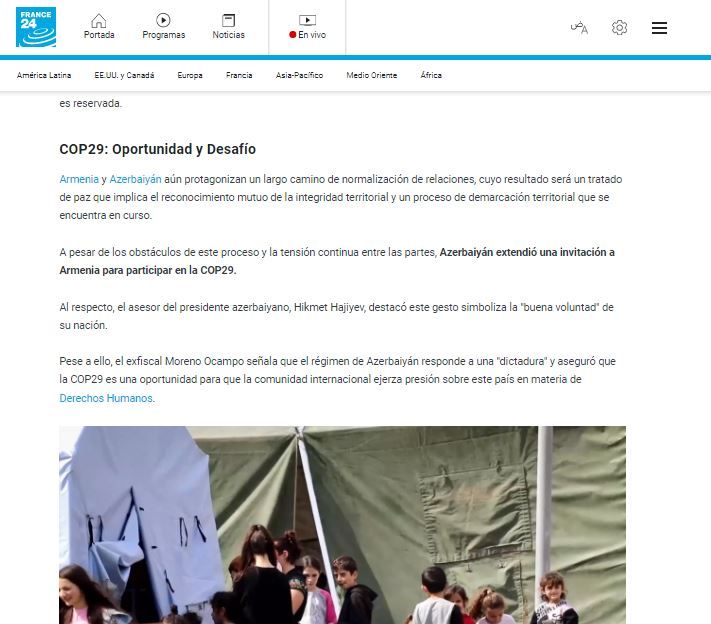 The channel discussed the "controversial" state of human rights in Azerbaijan, citing the “blockade” of Garabagh and the “forced” displacement of the “Armenian population” due to the local anti-terror operation carried out in September 2023. Despite official Yerevan not making such a claim, “France24” referred to the voluntary and threat-free departure of Armenians from Garabagh as “genocide” and cited the former prosecutor of the International Criminal Court, Luis Moreno Ocampo. The channel specifically broadcast the former prosecutor's claim that the imprisonment of separatists Arkadi Gukasyan, Bako Saakyan, and Arayik Harutyunyan in Baku was illegal.