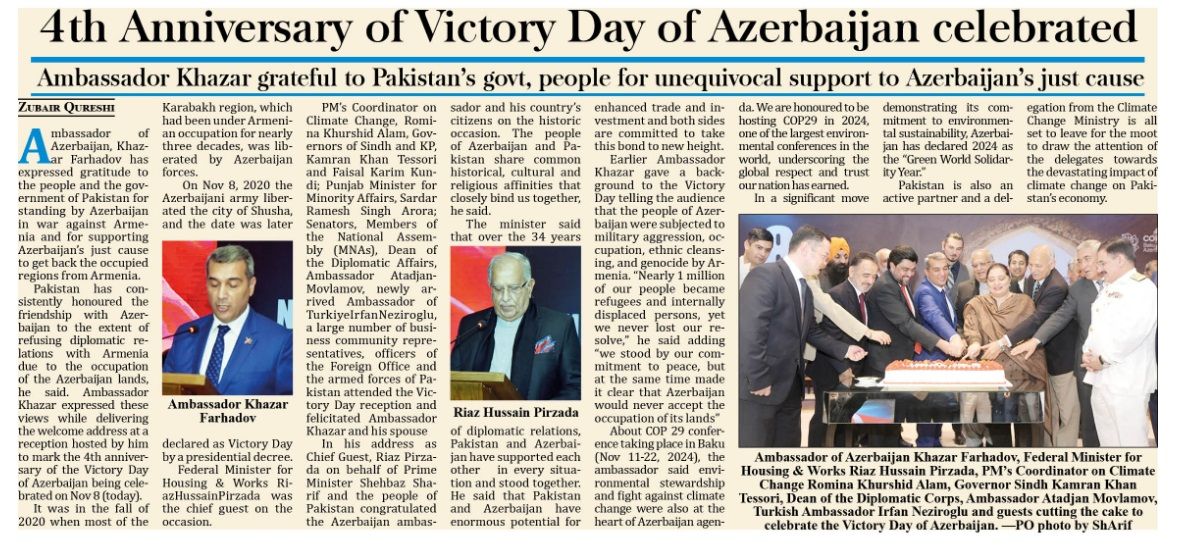 Pakistan's newspaper publishes article on Azerbaijan's Victory Day