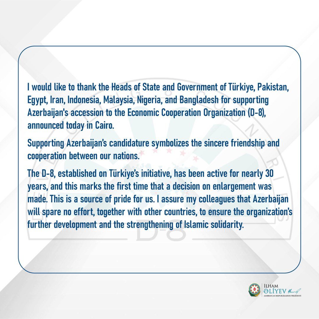 "I would like to thank the Heads of State and Governments of Türkiye, Pakistan, Egypt, Iran, Indonesia, Malaysia, Nigeria, and Bangladesh for supporting Azerbaijan's accession to the Economic Cooperation Organization (D-8), announced today in Cairo.
