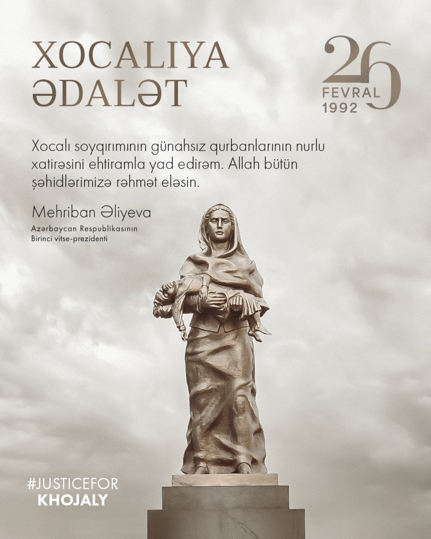 First Vice-President of the Republic of Azerbaijan Mehriban Aliyeva has shared a post on her official Instagram page on the Khojaly genocide, Azernews reports.