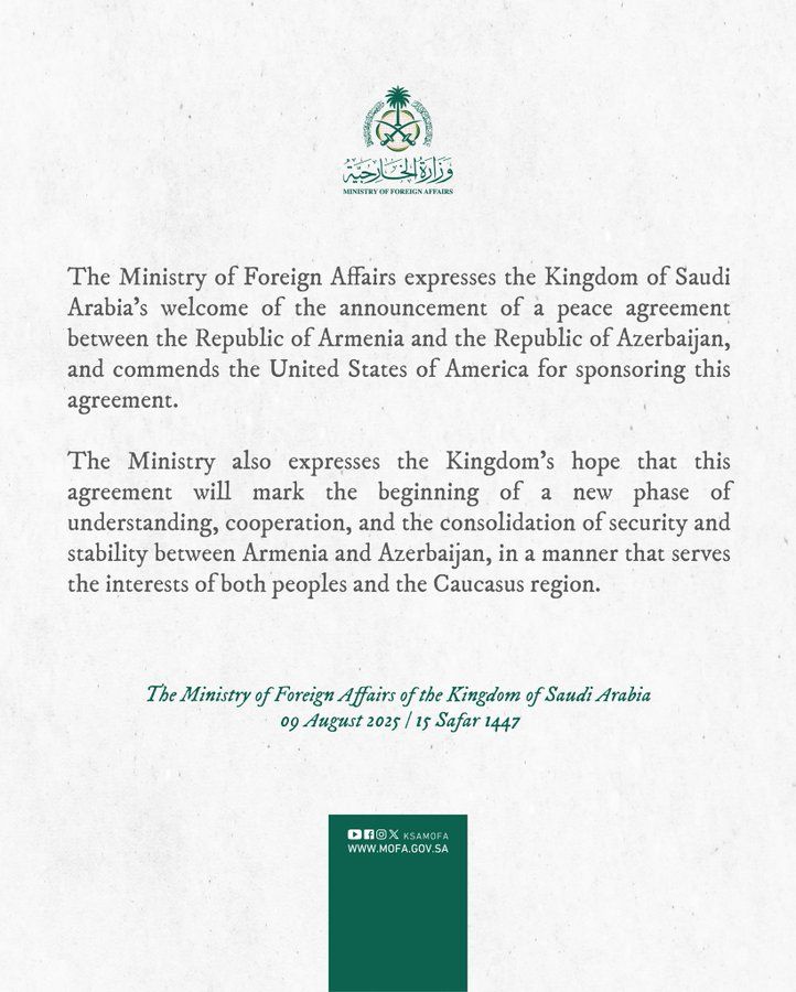 The Foreign Ministry expresses the Kingdom of Saudi Arabia’s welcome of the announcement of a peace agreement between the Republic of Armenia and the Republic of Azerbaijan, and commends the United States of America for sponsoring this agreement, according to the post shared on official X.