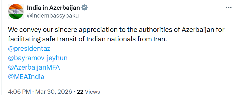 India has expressed gratitude to Azerbaijan for its assistance in evacuating Indian citizens from Iran amid the ongoing regional crisis.
