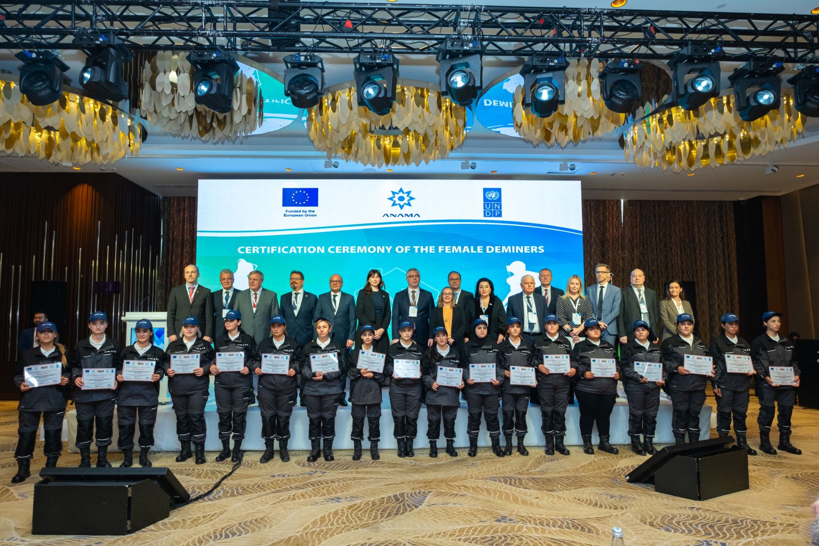 Eighteen wholehearted and strong Azerbaijani female deminers received their accreditation certificates successfully. Through the theoretical and practical trainings, the teams of female deminers acquired the foundational knowledge, necessary skills and the required code of conduct to recognize, detect and mark mines and unexploded ordnance, and to provide first aid.