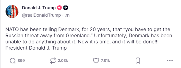 “NATO has been telling Denmark, for 20 years, that ‘you have to get the Russian threat away from Greenland.’ Unfortunately, Denmark has been unable to do anything about it. Now it is time, and it will be done!” Trump wrote on the Truth Social platform.