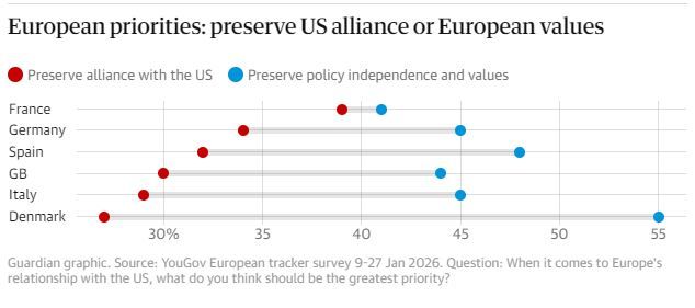 Most respondents agree that a serious breakdown in EU–US relations would be detrimental to Europe. Nevertheless, the Greenland dispute appears to have sharpened public thinking across Western Europe. In all six countries surveyed, the dominant view - held by 41% to 55% of respondents - was that strengthening European autonomy should now take precedence over preserving the transatlantic alliance.