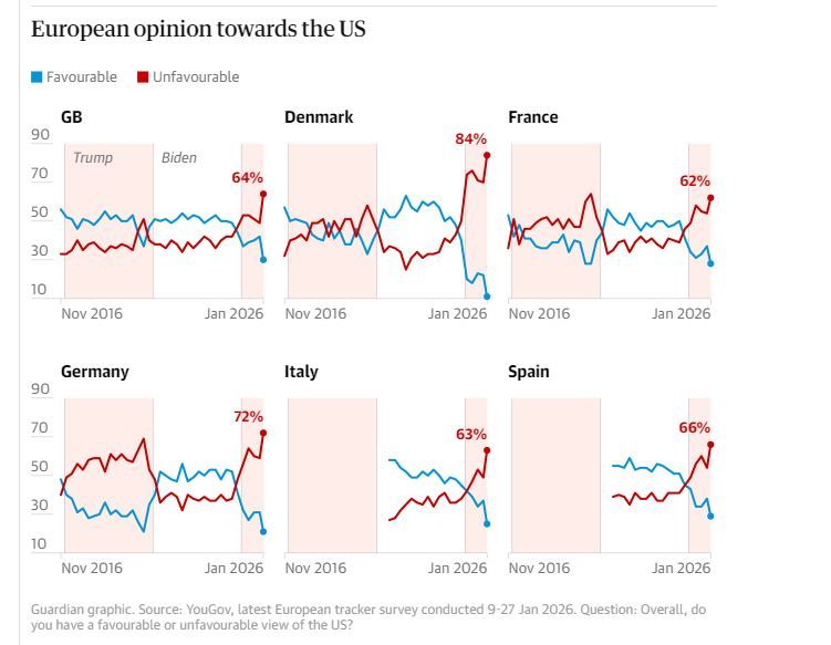 As reported by Azernews, citing Guardian, the decline in sentiment is largely attributed to actions and rhetoric associated with US President Donald Trump, including his renewed comments on Greenland. The issue has resonated particularly strongly in Denmark, where Greenland is a self-governing territory, accelerating a broader erosion of trust in the US across Europe.