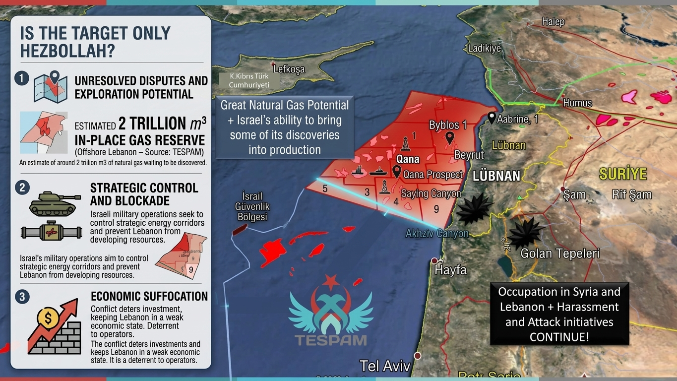 Beyond the battlefield, analysts say the conflict is increasingly shaped by competition over Eastern Mediterranean energy resources. A strategic briefing from the Center for Middle Eastern Strategic Studies (TESPAM) highlights that offshore reserves in Lebanese waters are becoming a central geopolitical factor.