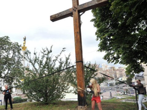 Activists from the Ukrainian feminist group Femen cut down the wooden crucifix with a chainsaw in mid-August allegedly in support of jailed members of the Russian punk band Pussy Riot. The crucifix was erected in 2004 in memory of the victims of political repression.