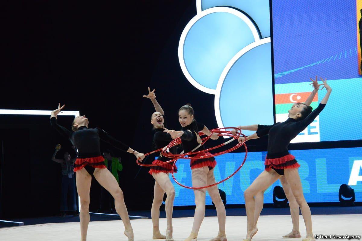 The first place at the FIG World Cup in Rhythmic Gymnastics in Baku in group exercises with five hoops was taken by a team representing Azerbaijan.