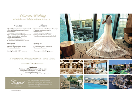 Fairmont Baku Flame Towers is the most elegant and sophisticated venue for the celebration of marriage. Experienced team of wedding specialists prepared exclusive wedding packages which will turn every moment of the wedding into unforgettable memory. Stunning ballroom, flawless service and exquisite menu will ensure the success of the event.